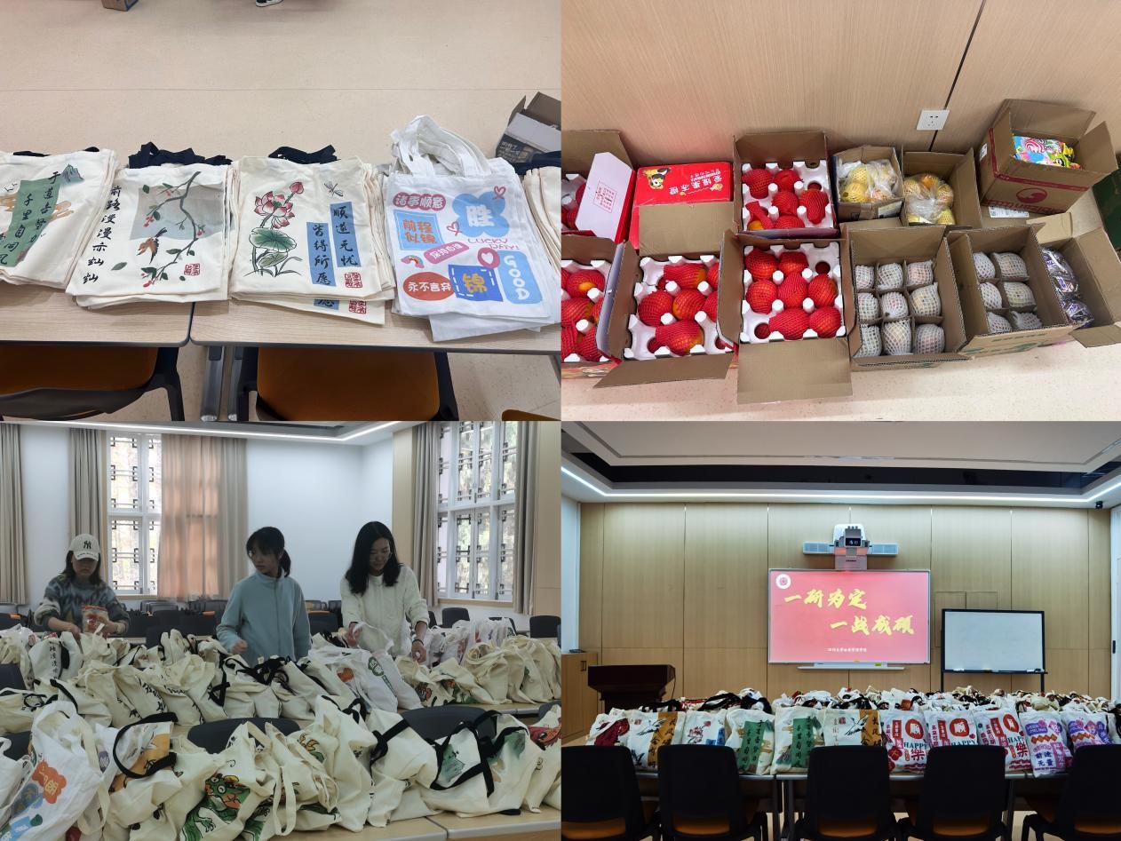 活动开始前,付亚南老师带领年级学生干部、党员一起为考研学子精心准备了暖心“加油包”,含有苹果——“苹”安顺利,橙子——心想事“橙”,柿子——事“柿”顺意,面包——“包”你上岸,蛋糕——“糕”枕无忧,士力架——“士”气昂扬,棒棒糖——“棒”上有名,旺旺雪饼——考试旺旺,祝福挂件——好事发生。共十件小礼物,代表对考研学子十全十美的祝福!