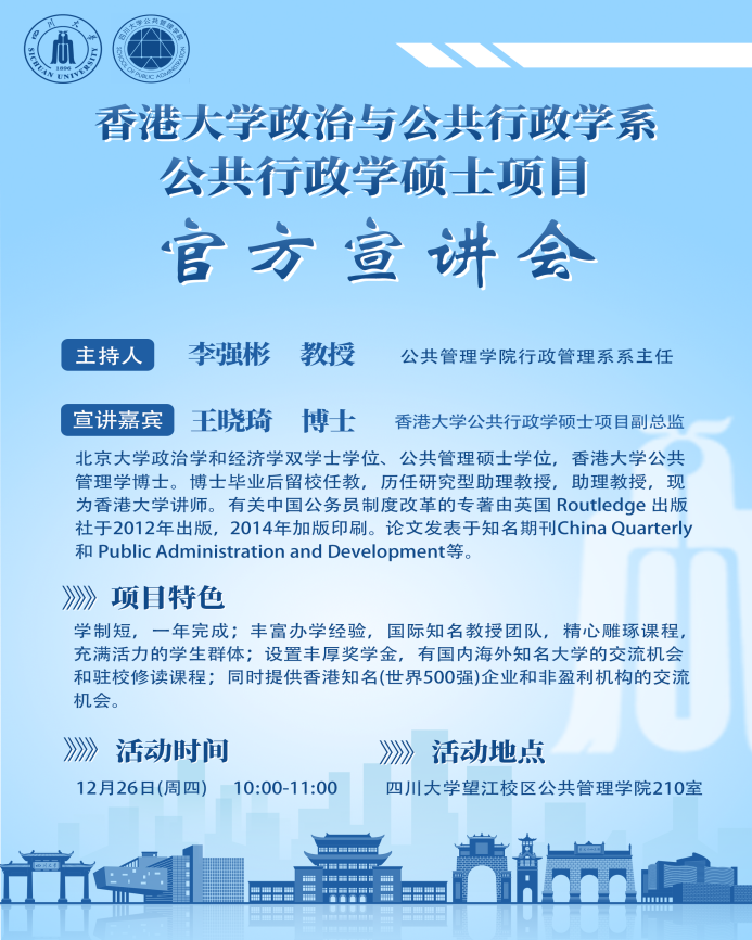 12月26日上午,香港大学公共行政学硕士项目副总监王晓琦老师到访PA视讯进行招生宣讲。本次宣讲会由学院行政管理系系主任李强彬教授主持,港澳台事务办公室事务科副科长张春艳老师、学院就业专职岗付亚南老师以及大三、大四20余位本科生参加。