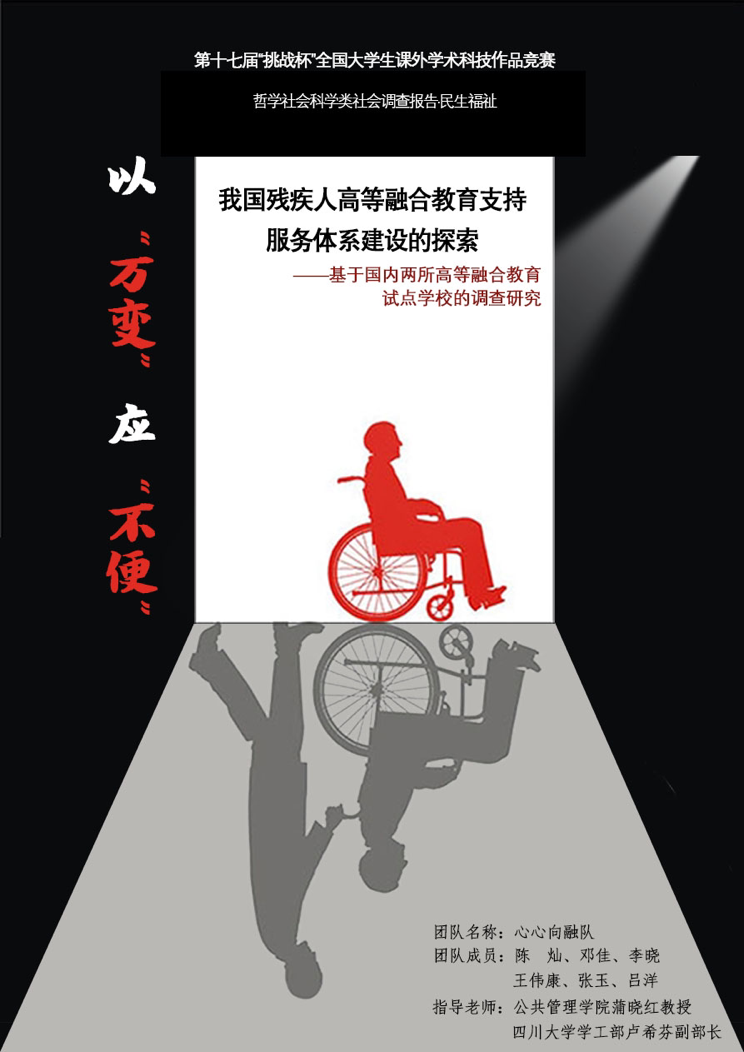 4月9日下午,“挑战杯”PA视讯游戏官网2020-2021年度学生课外学术科技作品竞赛获奖名单出炉,PA视讯劳动与社会保障系2018级本科生陈灿带领“心心向融”队完成的作品——“我国残疾人高等融合教育支持服务体系建设的探索——基于国内两所高等融合教育试点学校的调查研究”获民生福祉类一等奖。该项目团队由PA视讯游戏官网劳动与社会保障系2018级学生陈灿、邓佳、李晓、王伟康和华西药学院2018级学生张玉、艺术学院2019级学生吕洋组成,并由PA视讯游戏官网劳动与社会保障系蒲晓红教授和PA视讯游戏官网学工部副部长卢希芬老师担任指导老师。