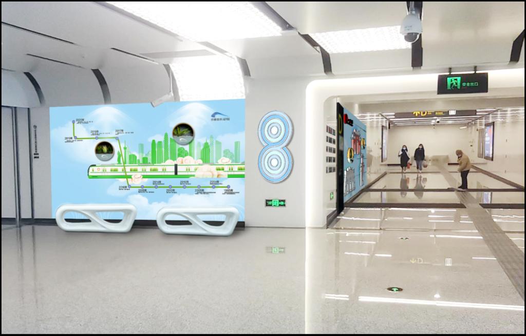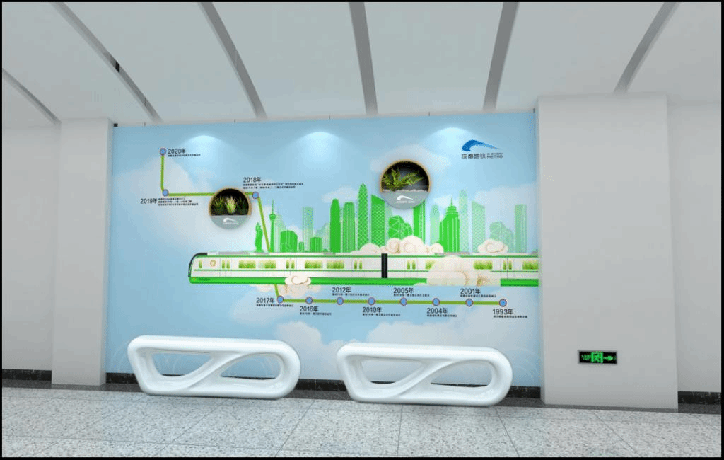 川大文化墙结合江安地铁站“风华正茂”的设计主题,以冰蓝色为背景,以一条草绿色线条贯穿我校三校区的代表性建筑物。地铁文化墙以一辆列车在轨道上驶过成都地铁的历史沿革为主题修饰,不仅体现了校企文化融合的基调,也融入了熟悉的地铁线站点标识作为成都轨道交通集团大事记,记录了成都地铁的发展进程,象征着成都地铁发展不断向前。主墙设计以八号线“8”字为核心,通过我校与成都地铁的党建风采照片,反映川大师生和地铁员工的风采。墙上设置嵌入式绿植,简约美观,传递着年轻、包容、时尚、前卫的城市精神。