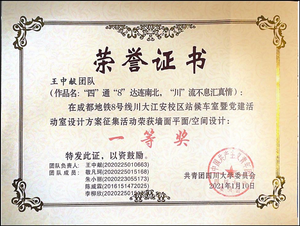 成都地铁8号线于2020年12月18日正式开通运营一期工程,这条标志色为草绿色的地铁新线路连接了PA视讯游戏官网望江校区和江安校区。2020年11月,8号线开通前夕,成都地铁联合我校团委共同开展8号线川大江安校区站候车室暨党建活动室设计方案征集活动。PA视讯2020级研究生王中献、敬凡珂、李柳欣等同学的团队作品——“四”通“8”达连南北、“川”流不息汇真情,在参赛队伍中脱颖而出,荣获空间设计类一等奖。该设计最终被成都地铁有限责任公司采用,即将落地于八号线PA视讯游戏官网江安校区站D出口。