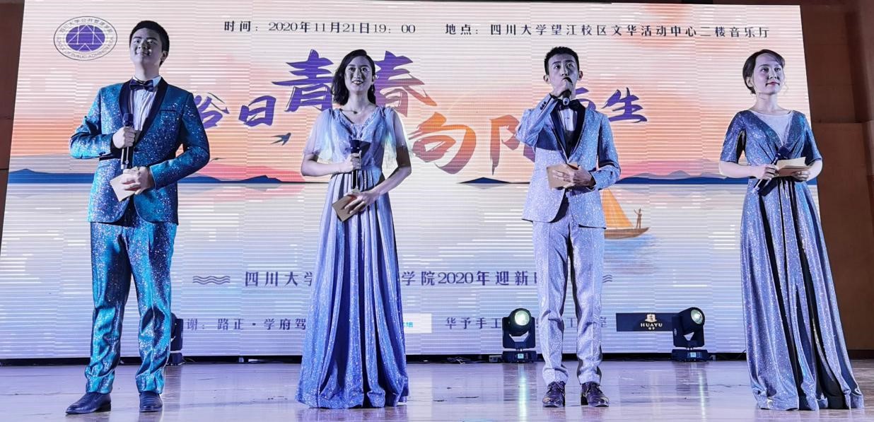 晚7时,由同学们自编、自导、自演的迎新晚会同名微电影《浴日青春· 向阳而生》准时上映。一张小小的明信片连接起2008年和2020年两个不同时空,各自经历时代磨难的男生与女生,他们经凤凰涅槃,跨越时空在川大相遇,同迎盛大日出。随即,四位主持人闪亮登台,在他们激情澎湃的开幕词后,晚会正式开始。