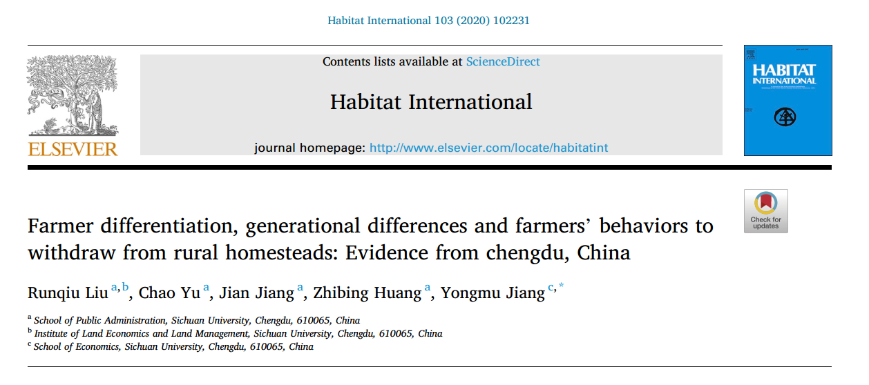 PA视讯刘润秋师生等人于2020年8月在《Habitat International》发表学术论文《Farmer differentiation, generational differences and farmers’ behaviors to withdraw from rural homesteads: Evidence from chengdu, China》。该论文属于刘润秋教授主持的国家社会科学基金项目“典型试点区域宅基地退出的绩效评价与路径优化研究”(项目号:17BJY091)的阶段性研究成果。PA视讯土地资源与房地产管理系刘润秋教授为第一作者,博士生余超为第二作者,硕士生蒋健和博士生黄志兵分别为第三、四作者。
