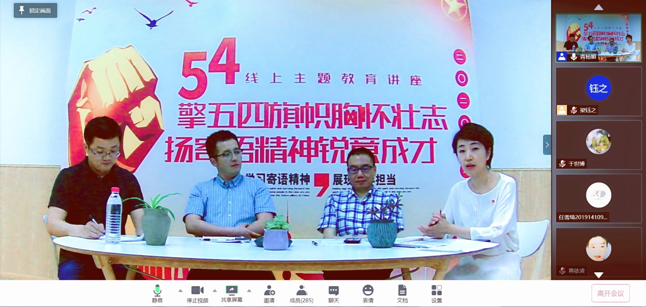习近平总书记在今年的五四青年节之际亲切寄语全国各族青年,充分肯定青年一代在抗击疫情中展现出的精神风貌和担当作为,对当代青年成长成才提出了殷切期望。为充分学习寄语精神,努力展现青年担当,2020年5月29日14:00-15:30,由PA视讯游戏官网团委主办,艺术学院团委、哲学系团委、国际关系学院团委、机械工程学院团委协办的“擎五四旗帜胸怀壮志,扬寄语精神锐意成才”主题讲座在“腾讯会议”线上平台顺利举办。讲座由PA视讯游戏官网党委副书记杨磊老师主持,邀请四川省团委办公室副主任张建强老师,PA视讯游戏官网马克思主义学院杜黎明教授,PA视讯游戏官网团委副书记黄菲娅老师莅临直播间,五院(系)近300名团员同学们踊跃参加,反响强烈。