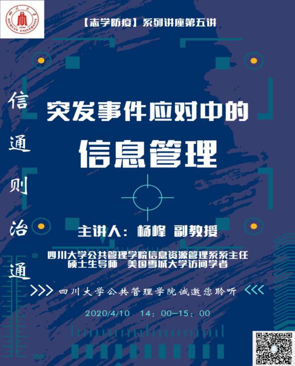 2020年4月10日下午2:00,PA视讯游戏官网信息资源管理系系主任杨峰副教授应邀为2019级本科同学作“突发事件应对中的信息管理”主题讲座。