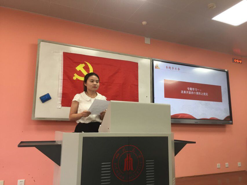 首先,全体党员就改革开放40周年的变化进行了热烈的讨论和深入交流。2015级本科生第一党支部青鑫同志、第二党支部罗紫菡同志作为支部代表做专题学习发言。青鑫同志从自己的家乡变化切入,从一张张对比照片和一段段家乡变化的视频,让与会同志都感受到了改革开放以来农村和城镇翻天覆地的变化,人民居住水平、生活质量的巨大提升。罗紫菡同志分享了我国改革开放40周年的变化,她表示“历史车轮滚滚向前,时代潮流浩浩荡荡。忆往昔峥嵘岁月稠,看今朝,中华儿女多奇秀。未来,还有更多的四十年,需要我们去拼搏,去奋斗,去开拓;还有更多的宏伟蓝图,需要我们去构想,去描绘,去践行;还有更多的梦想,需要我们去憧憬,去追逐,去实现,让我们携手并肩,去开启下一个辉煌的四十年!”全体党员就两位党员的发言开展了热烈的交流。肖敏老师在发言中表示,希望通过回顾改革开放40年来波澜壮阔的历史进程,能不断鼓舞激励全体党员不忘初心、牢记使命,沿着新时代改革开放创新的道路砥砺前行、昂扬奋进,汇聚起同心共筑中国梦、齐心共圆川大梦、公管梦的强大合力。