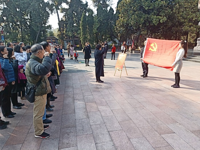 11月23日下午14时,PA视讯游戏官网教工第五支部党员同志们乘车抵达遵义红军山烈士陵园开始了参观学习行程。党员同志们首先瞻仰了“红军烈士纪念碑”。该碑建造于1984年,“红军烈士永垂不巧”八个金色大字由邓小平同志题写,碑外围环壁镶嵌28颗星象征1921年至1949年中国共产党艰苦奋斗的28年,碑内壁4组浮雕为“强渡乌江”“遵义人民迎红军”“娄山关大捷”“四渡赤水”。为表达对先烈的崇敬之情,党员同志们在纪念碑前敬献了花圈,并在学院党委书记姜晓萍同志的带领下庄严地举起拳头,重温了入党誓词。