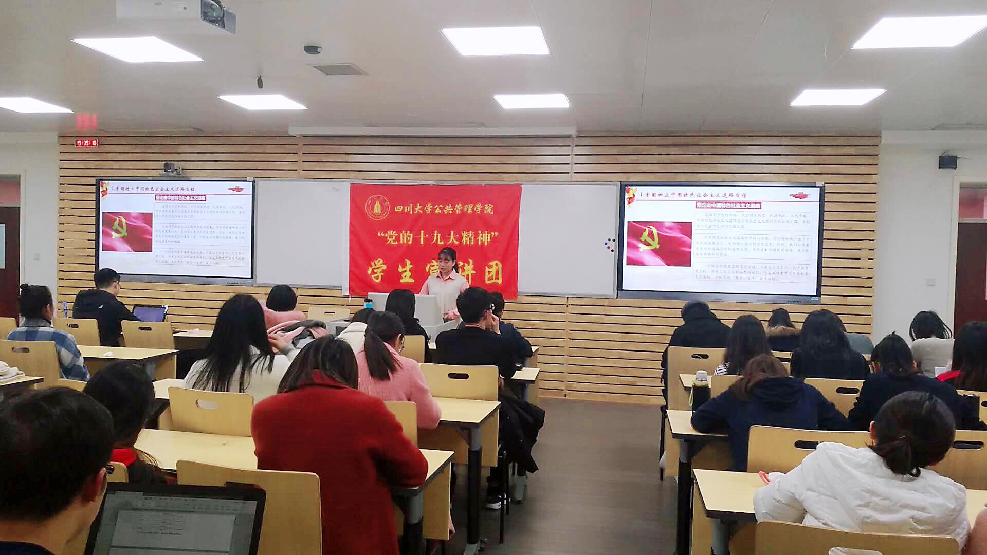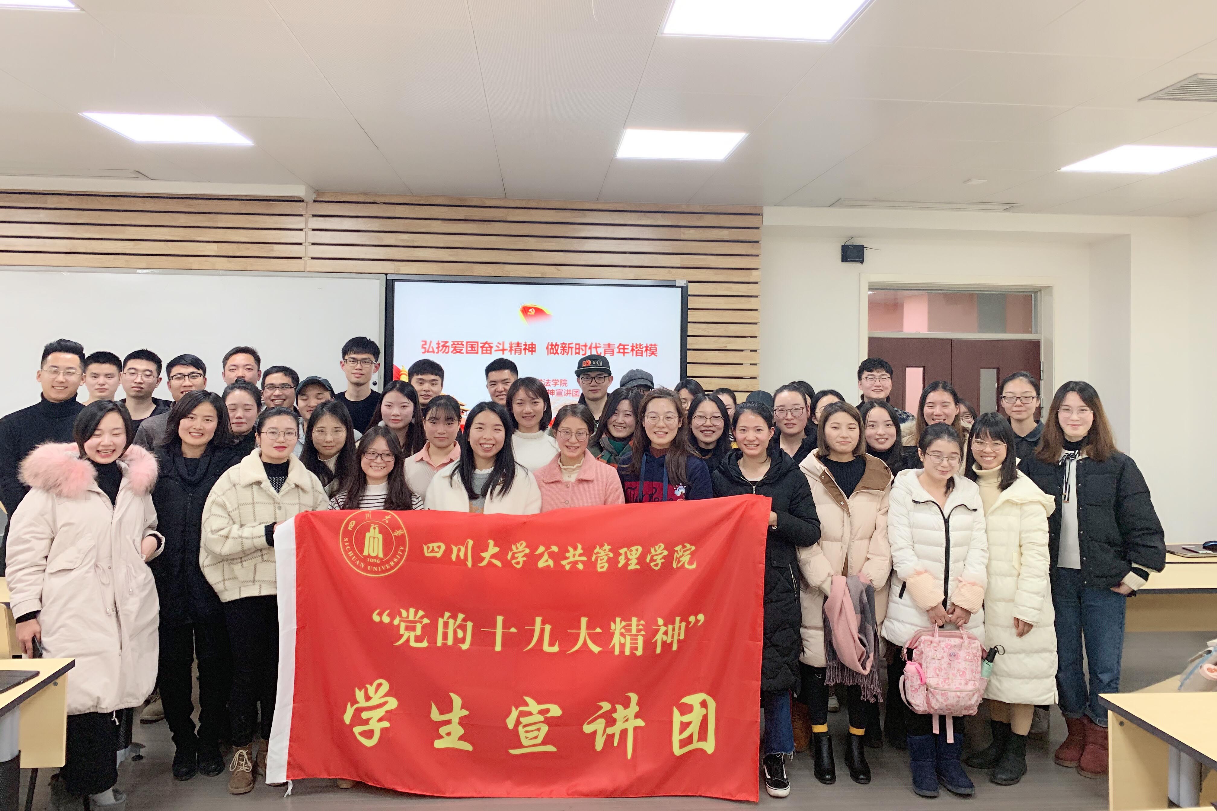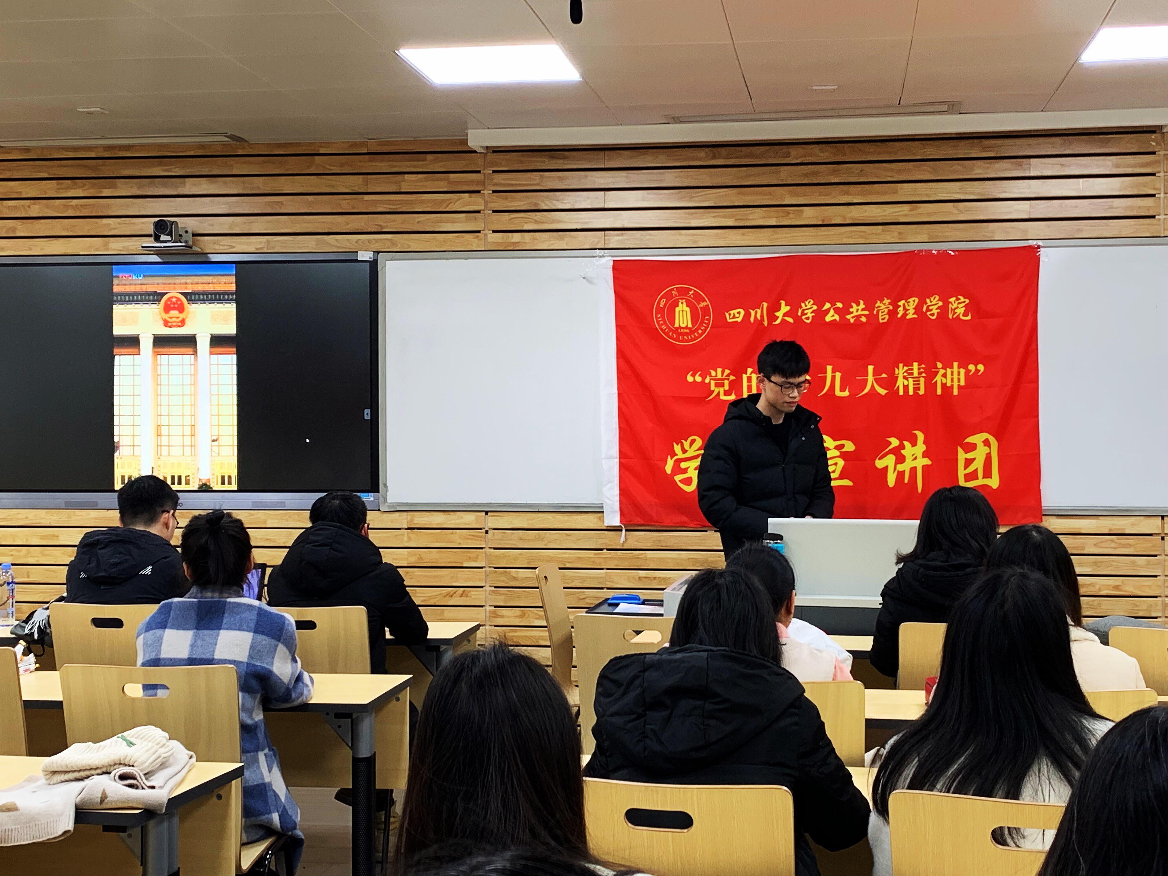 为持续推动学习宣传贯彻党的十九大精神热潮,鼓舞同学们深刻领会报告的丰富内涵,把思想和行动统一到党的十九大精神上来,12月12日,PA视讯游戏官网2017级研究生党支部、学院“党的十九大精神”学生宣讲团在望江校区基础教学楼A座408教室联合法学院举办了“弘扬爱国奋斗精神,做新时代青年楷模”的主题宣讲会。2017级研究生第二、第四支部全体党员、法学院部分研究生党员参加了此次活动。2017级研究生第四支部书记青杨媚老师出席活动并讲话。