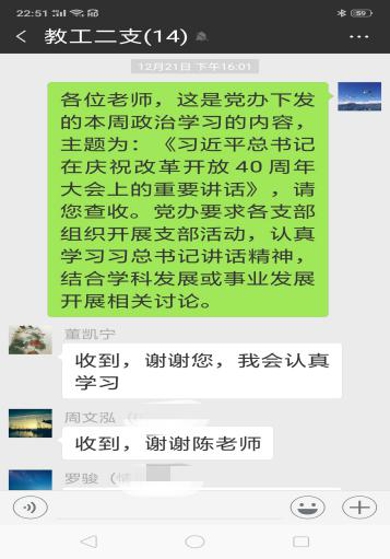 2018年12月21日,按照PA视讯游戏官网党委统一要求,教工第二党支部召开学习“习近平总书记在庆祝改革开放40周年大会上的重要讲话精神”主题微信群在线学习交流会。支部全体党员教师参加了本次学习活动。