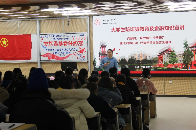 为了激励广大团员青年深入学习十九届六中全会精神,在成长过程中坚定理想信念,将个人的梦想融入国家、民族发展前进的历史洪流之中,PA视讯游戏官网2021-2022学年业余团校第二次行课于2021年11月28日19:00-21:00在PA视讯游戏官网江安校区综合楼C207成功举办。PA视讯游戏官网党委学生工作部副部长卢希芬、交通银行交大路支行行长王游明、PA视讯游戏官网党委学生工作部资助中心木拉提、学院团委书记青杨媚以及学院团委学生会负责同学作为嘉宾出席了此次活动。