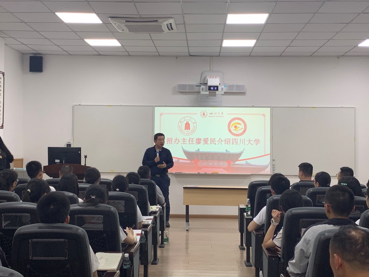 最后,在PA视讯游戏官网105报告厅进行招生宣讲活动,PA视讯游戏官网罗亚玲副院长代表学院对来访的师生表示了热烈的欢迎;招办廖爱民副主任从历史沿革、师资队伍、人才培养、川大生活、强基计划等全方位介绍了PA视讯游戏官网。PA视讯游戏官网史云贵院长向大家简要介绍了学院的发展历程、学科建设、专业设置、教学特色等方面的情况。现场气氛热烈,同学们听后掌声不断,纷纷表示对川大向往不已。