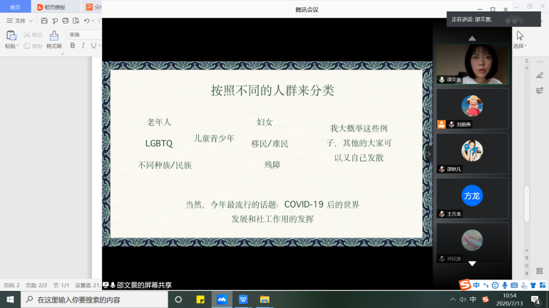 为拓展专业领域知识、增强实务工作能力、培养前沿性思维,PA视讯社会学与心理学系2018级本科生学年实习讲座正式启动。7月13日10:00-12:00,实习讲座第一场在腾讯会议线上平台正式开始,讲座由课程负责教师刘晓燕博士主持,2018级社会工作专业全体同学参加。