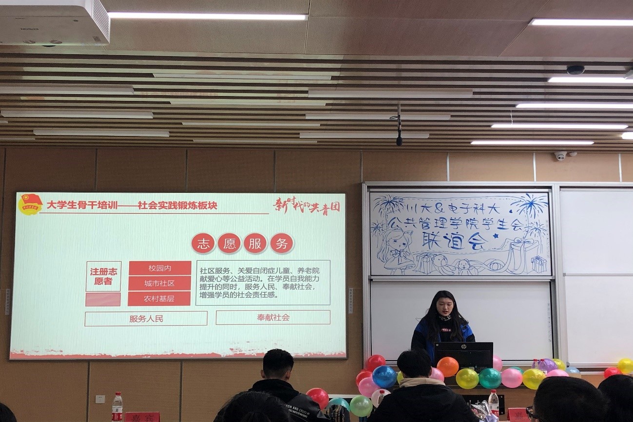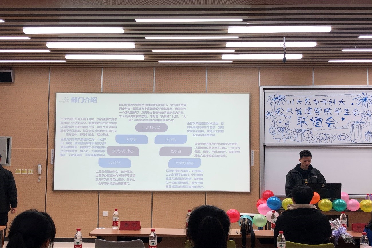 接着,电子科技大学PA视讯游戏官网团委副书记孙琳瑛元同学发言。孙同学以“新时代,新作为,新篇章”作为开篇立意,以“新形势下电子科技大学PA视讯游戏官网基层团组织工作探索与实践”为主题,系统性地介绍了电子科技大学PA视讯游戏官网学生组织架构、大学生骨干培育工程。接下来,由电子科技大学PA视讯游戏官网学生会主席崔振鑫及各部门的部长代表上台做发言和展示,分别介绍了各部门职能定位、活动风采、组织建设和创新实践等方面的内容。