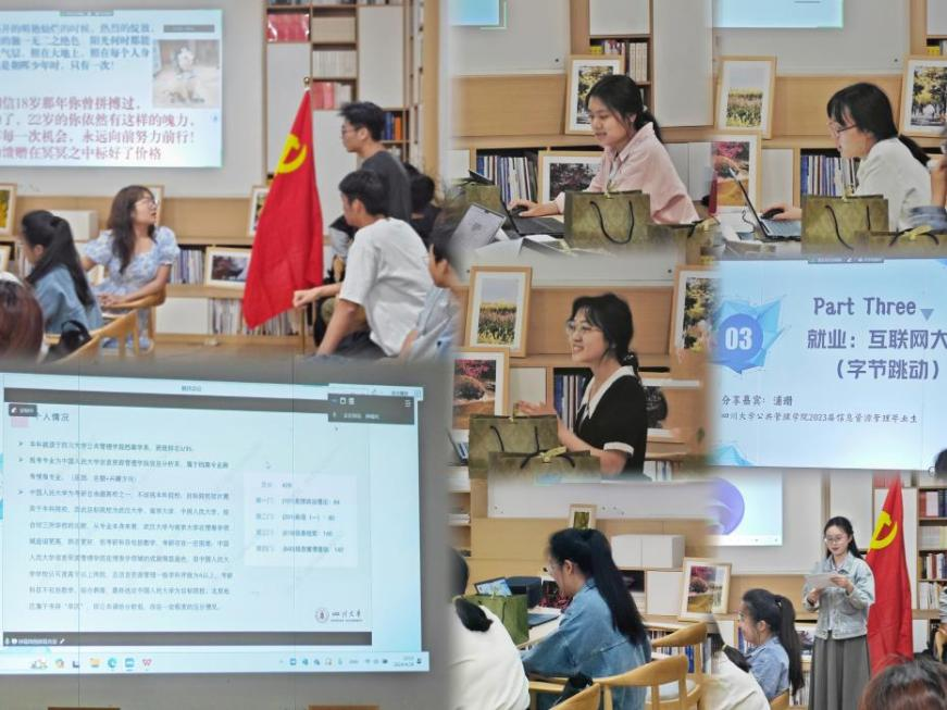 学生分享环节,钟瑞玲、牛重阳、袁绮蔓、邓淼、余悦、熊小芳等分别就考研、考公、求职、留学与保研进行了详实的经验分享。主持人转述了浦珊与董乾坤在互联网公司等企业的就业心得。