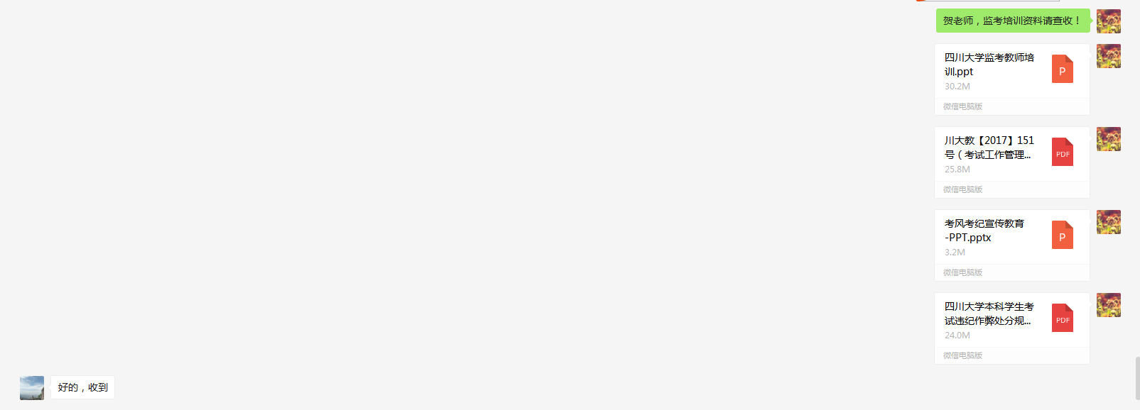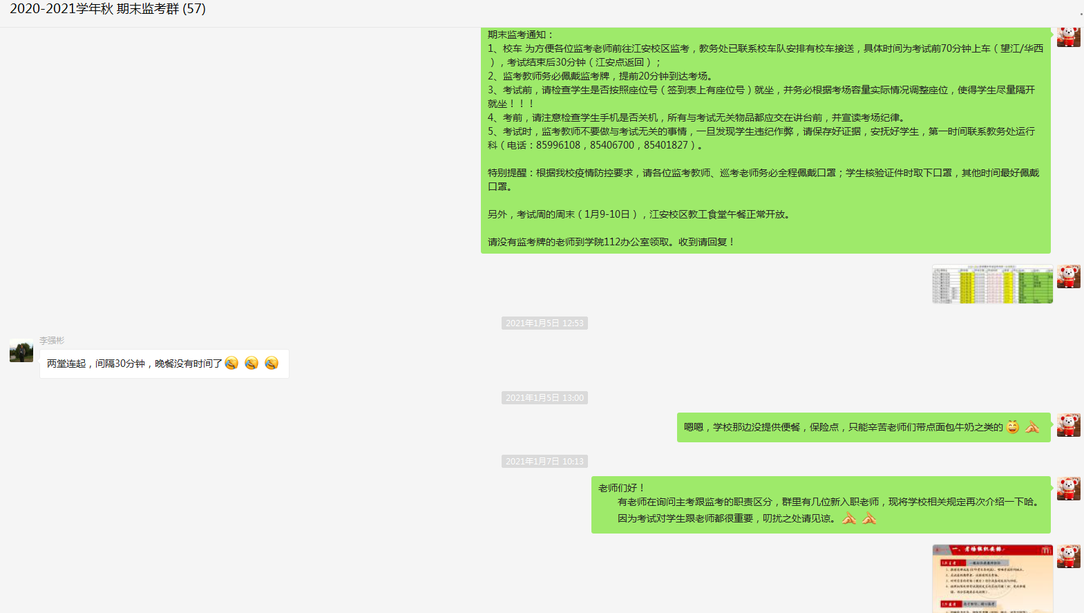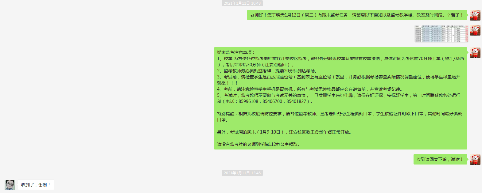 学院制定有《PA视讯游戏官网本科生考试监考工作暂行规定》(川大公管﹝2020﹞6号文)专门文件对监考人员安排进行规范管理。监考人员确定后,建立单独微信群,发布考风考纪宣传教育PPT及其他注意事项。考试前一天,安排教务人员通过微信、电话、OA等方式逐一提醒监考教师注意监考教学楼、教室、时段等信息,确保监考教师收到通知并回复。