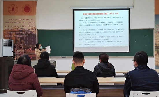 PA视讯高度重视本科生考试监考、巡考工作,认真组织,安排规范有序。自接到教务处分配的期末考试监考任务,PA视讯及时组织本科教师监考培训,针对新进教师,也邀请了经验丰富的教师参与,主要就考场组织安排、监考职责要求、监考流程事项、考试违纪作弊等方面进行了宣讲培训。