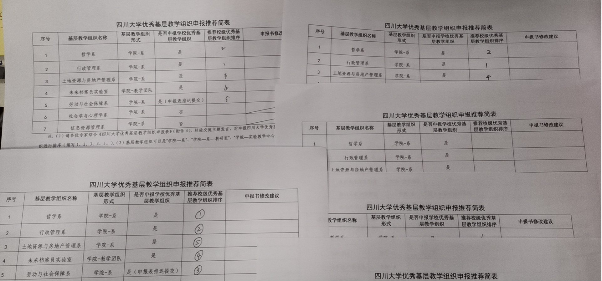 综合审查后,学院本科教学督导组倪道善教授、徐恩元副教授、赵英教授、李晓梅副教授、张爽老师通过排序的方式进行推荐。最终,行政管理系基层教学组织获得3票排序第一、哲学系基层教学组织获得2票排序第一,获得学院推荐参加校级优秀基层教学组织参评资格。