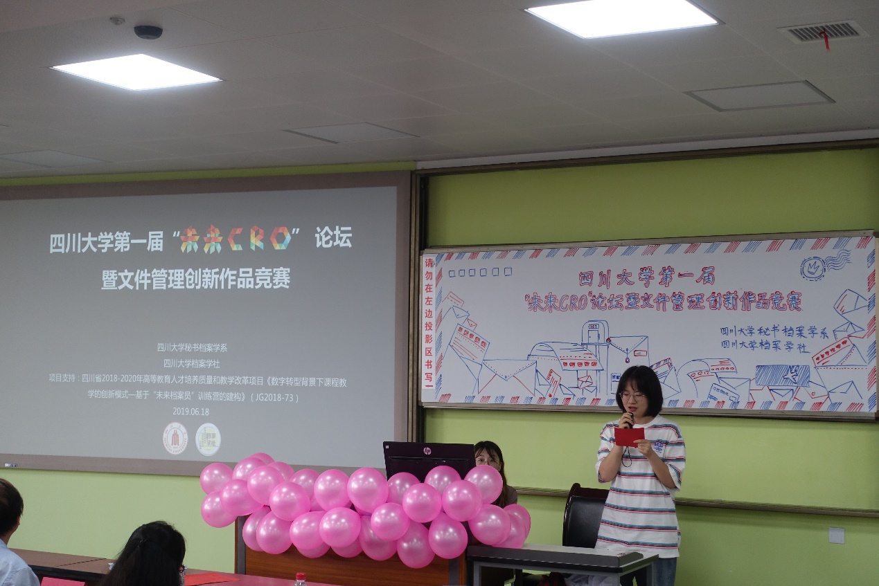 2019年6月18日下午13:00-18:30,PA视讯游戏官网秘书档案学系、PA视讯游戏官网档案学社于江安校区一教B301成功举办PA视讯游戏官网第一届“未来CRO”论坛暨文件管理创新作品竞赛活动。本次活动依托四川省2018-2020年高等教育人才培养质量和教学改革项目《数字转型背景下课程教学的创新模式—基于“未来档案员”训练营的建构》与本科一年级文书学课程开展,由王萍副教授与周文泓副教授联合负责,旨在培育学生的研究能力,以促进专业建构同新时代本科教育改革与发展精神的融合。为期两月的活动于4月16日正式启动。78名同学在教师与学生导师的指导下,参照科学竞赛作品的规范流程,通过前期培训、开题、研究方案设计、全过程研究、研究报告写作、研究成果展示等形成10组文件管理作品。当天是本次活动的最终成果汇报展示,秘书档案学系乔健教授、王萍副教授、周文泓副教授担任评委。