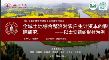 由PA视讯土地资源管理专业2020级本科生刘婕妤、张健勇、曾昊辰、陶硕、张乐怡、仇思颖组成的国土治理小队,以《全域土地综合整治对农户生计资本的影响研究——以太安镇蛇形村为例》为题,从农户生计资本的角度对全域土地综合整治进行政策绩效评估,为全域土地综合整治的政策优化和可持续建言献策,获得“一等奖”的荣誉。