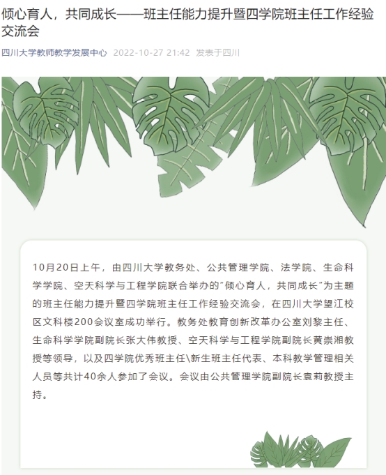 (1)学院成功组织举办班主任系列活动3场,走进学生,倾听心声,促进学生与班主任的共同成长。联合组织校级活动倾心育人,共同成长——班主任能力提升暨四学院班主任工作经验交流会。