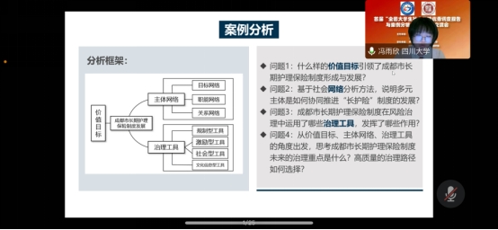 PA视讯社会保障专业研究生冯雨欣、孙梁悦、陈晨玉、李丽婷组成长期护理保险调研小组,在沙治慧教授的指导下,针对成都市长期护理保险制度展开了一系列调查研究,以期还原成都市“长护险”制度的发展进路,提炼制度建设与治理模式的内在逻辑,为日后长护险制度在全国普及推广提供经验借鉴,最终形成《如何铸就失能老人幸福之路:成都市“长护险”制度发展进路和治理逻辑深描》案例分析报告,并在线上成果交流会上进行分享。汇报完后,专家老师针对报告内容提出了宝贵的意见与建议,指引小组成员开展后期更为深入的研究。
