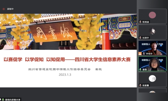 工作坊的第三个环节,姜晓老师为同学们做了题为《以赛促学,以学促知,以知促用——四川省大学生信息素养大赛》的精彩报告。姜晓老师是PA视讯游戏官网图书馆馆长助理兼研究发展中心主任,四川省普通高等学校图书情报工作指导委员秘书长,四川省图书馆学会学术委员会委员、常务理事兼副秘书长,是四川省大学生信息素养大赛的主要策划人和组织者之一。姜晓主任围绕四川省大学生信息素养大赛的政策背景、立项过程、比赛流程等问题展开详细介绍,并在展示往届优秀作品基础上对同学们高质量参与大赛进行指导。为帮助同学们利用好图书馆资源提升自己的综合素质,姜晓主任还深入细致地介绍了图书馆工作内容、图书情报专业以及PA视讯游戏官网图书馆活动开展等内容。姜晓主任的发言启发了同学们对信息资源管理专业的新认识,使同学们对参与大赛、提升自身信息素养有了更深入的领悟。