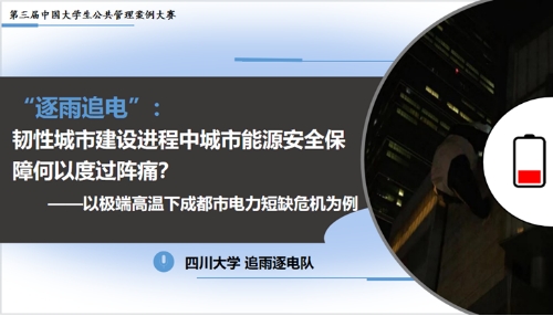 在行政管理系张伟研究员的悉心指导下,由PA视讯行政管理专业2020级本科生王谌诗棋、劳动与社会保障专业2020级本科生金珂安、牟芳娇同学组成的追雨逐电队,凭借高质量的案例文本与决赛现场的精彩答辩赢得了评委专家的高度肯定,最终斩获全国“金奖”荣誉。参赛案例《“逐雨追电”:韧性城市建设进程中城市能源安全保障何以度过阵痛?——以极端高温下成都市电力短缺危机为例》聚焦于今夏成都市供电危机事件,运用韧性理论和4R危机管理理论分析了危机爆发的现实困境和延伸逻辑进而从城市能源安全供给的视角寻求成都市韧性城市建设的突破路径。