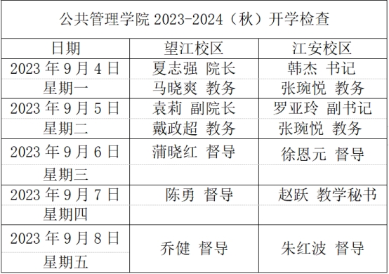 学院提前制定开学教学检查一周工作安排表,做到望江、江安两个校区全覆盖,并将开学教学检查责任落实到个人,全院正副职院领导、本科教学督导组成员、本科教务秘书、本科教学管理人员均参与检查。学院党委书记韩杰、院长夏志强、副书记罗亚玲,副院长袁莉,教学督导组、本科教务秘书以及本科教学管理人员等对新学期的课程安排与上课情况进行了检查。开学检查分设望江校区和江安校区两个部分,以下是PA视讯制定并依之执行的开学教学检查安排表: