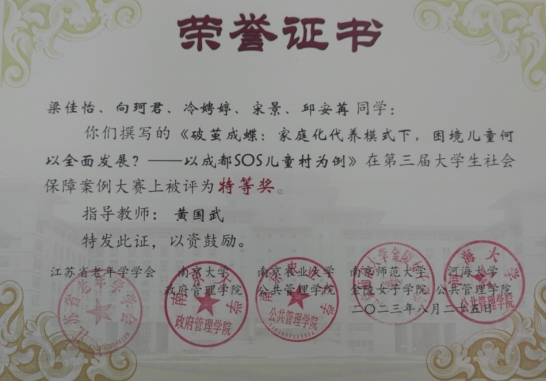 在PA视讯劳动与社会保障系黄国武老师的指导下,2020级行政管理专业本科生梁佳怡、2021级行政管理专业本科生邱安苒、2021级劳动与社会保障专业本科生向珂君、冷娉婷、宋景五位同学组成参赛团队,通过前期讨论选题、克服实地调研的种种困难等,于七月底共同完成案例分析报告《破茧成蝶:家庭化代养模式下,困境儿童何以全面发展?——以成都SOS儿童村为例》,经过初赛专家评审,团队最终进入决赛,通过案例展示、现场答辩等突出表现,一举斩获全国特等奖,充分展现了川大PA视讯游戏官网学子“公成天下、管法自然”的浓厚情怀和扎实的学科素养。