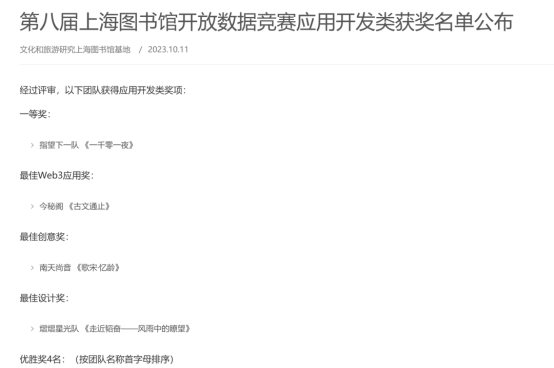 10月8日,第八届上海图书馆开放数据竞赛应用开发类决赛答辩于上海图书馆举行。此次比赛由上海市经济和信息化委员会、上海市文化和旅游局指导,由上海图书馆(上海科学技术情报研究所)、国际科学技术信息理事会(ICSTI)、上海市中心图书馆主办,与CADAL项目管理中心、中国历代人物传记资料库项目(CBDB)、复旦大学图书馆等多家单位进行合作。本届大赛以“链汇古今,AI赋人文”为主题,面向全球征集优秀移动应用原型、创意及算法。上海图书馆开放数据竞赛自2016年起已成功举办7届,被列入PA视讯游戏官网信息资源管理专业竞赛名单。大赛共吸引来自28个省市、国内外的一百多支队伍参赛,参赛选手涵盖了高校学生、企业团队、政府人员。本届大赛共设有应用开发类赛道、创意论文类赛道和算法类赛道,其中应用开发类赛道设一等奖1名、最佳Web3应用奖1名、最佳创意奖1名、最佳设计奖1名和优胜奖4名。