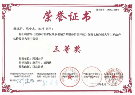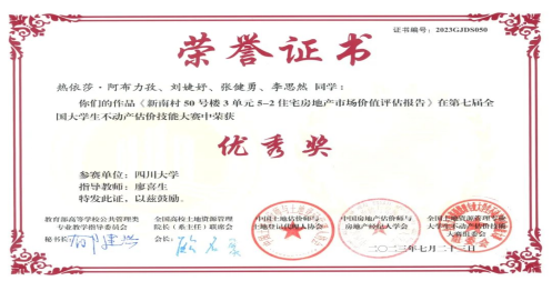 PA视讯2020级土地资源管理专业本科生甄悦昕、陈小杰、陶硕凭借《成都市郫都区战旗书屋公共服务价值评估》估价报告获得三等奖。热依莎·阿布力孜、刘婕妤、张建勇和李思然凭借《新南村50号楼3单元5-2住宅房地产市场价值评估报告》获得优胜奖。