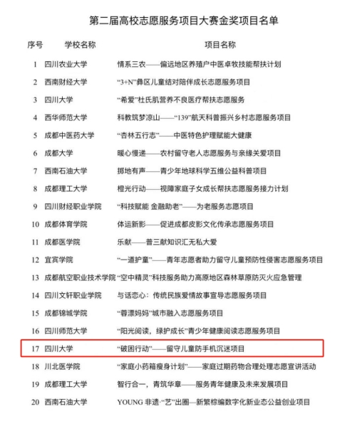 10月26日至27日,第二届四川省高校志愿服务项目大赛在四川宜宾举行,PA视讯学生牵头组队的《“破困行动”——留守儿童防手机沉迷》创意项目在本次大赛中斩获金奖。赛事由共青团四川省委、中共四川省委教育工作委员会、四川省精神文明建设办、四川省民政厅、四川省科学技术协会共同主办,四川青年志愿者协会等组织共同承办。团队成员包括2021级社会工作专业本科生潘奕成、2021级行政管理专业本科生申羽茜、2021级行政管理专业本科生傅珏华、2022级公共管理大类专业本科生张晶涵以及两名艺术学院学生。